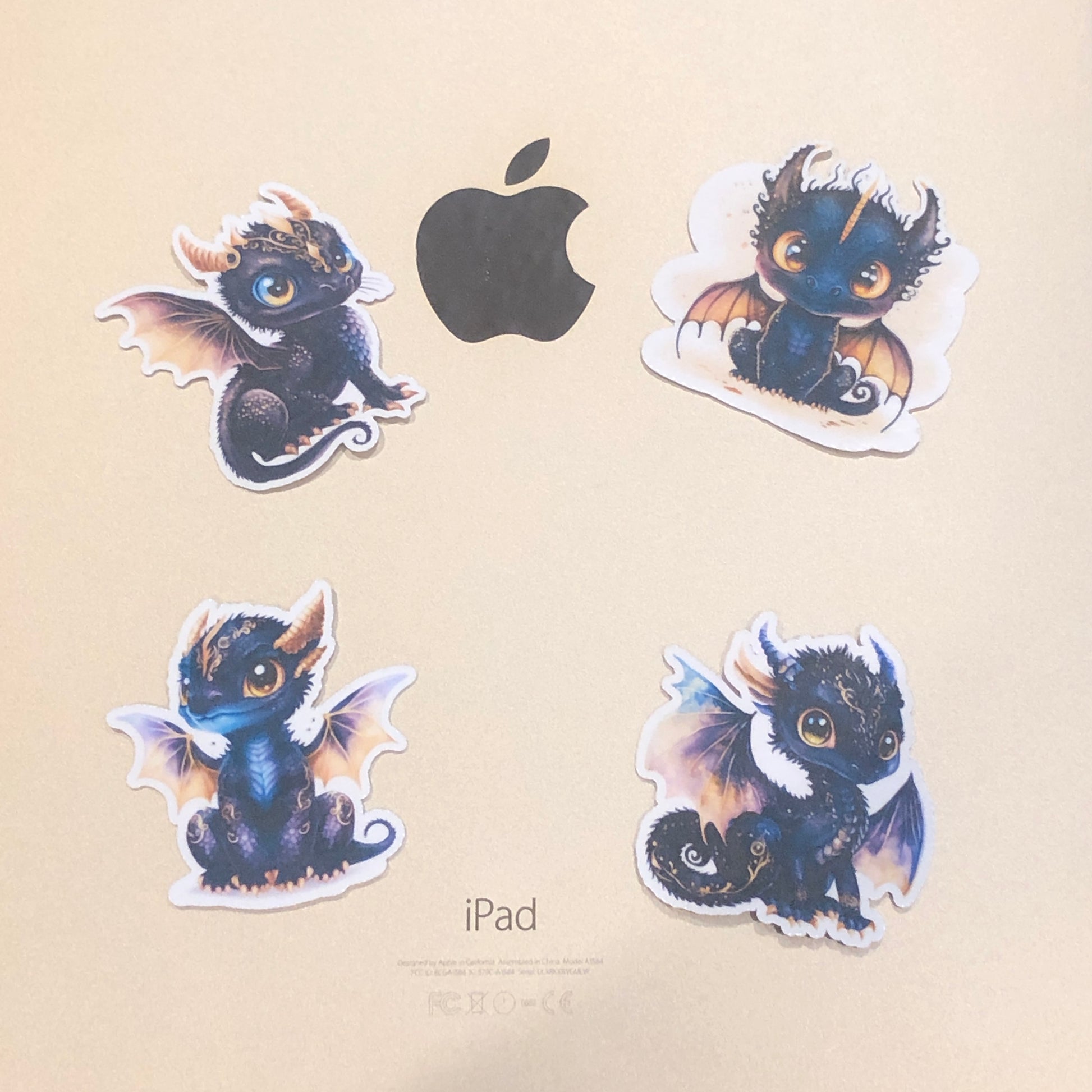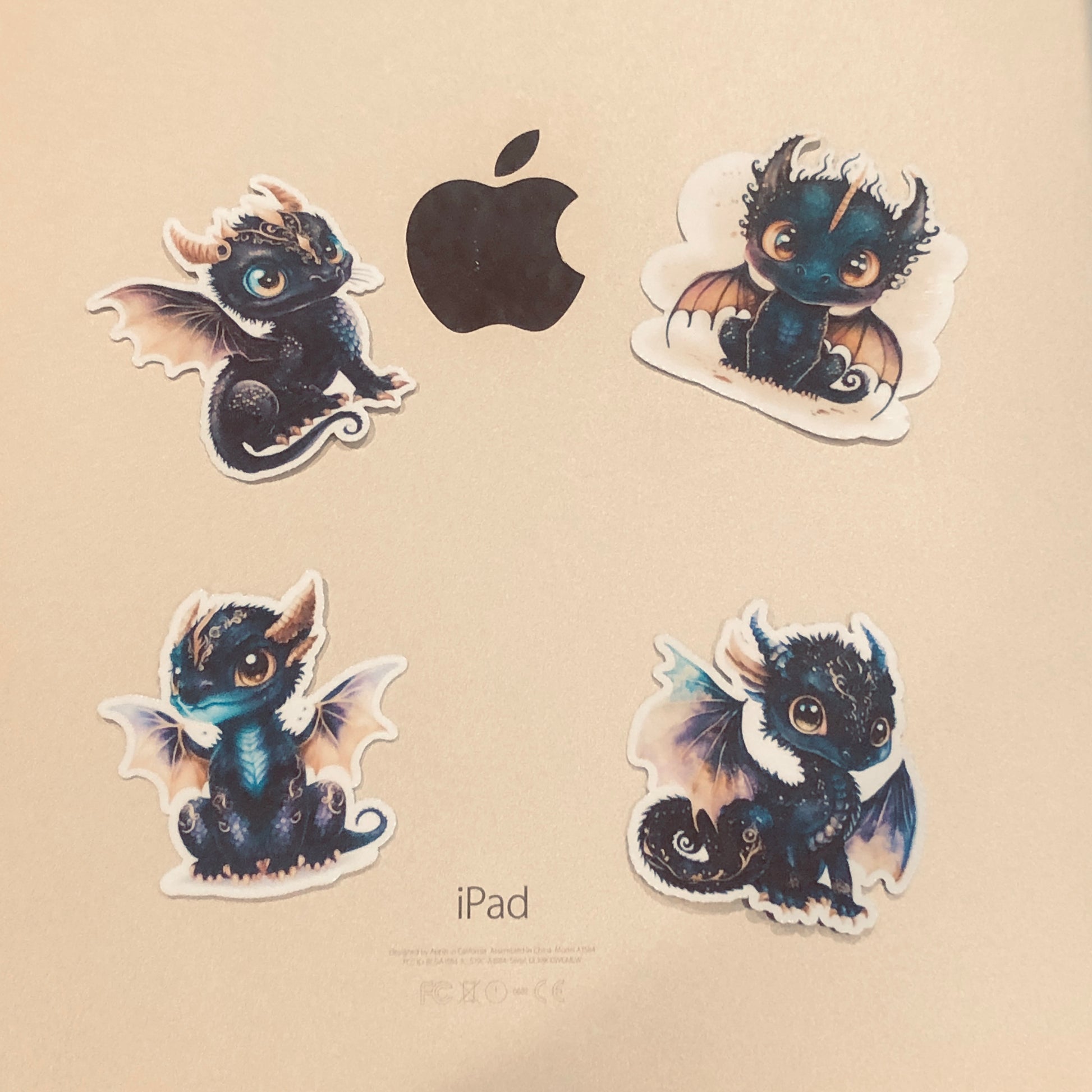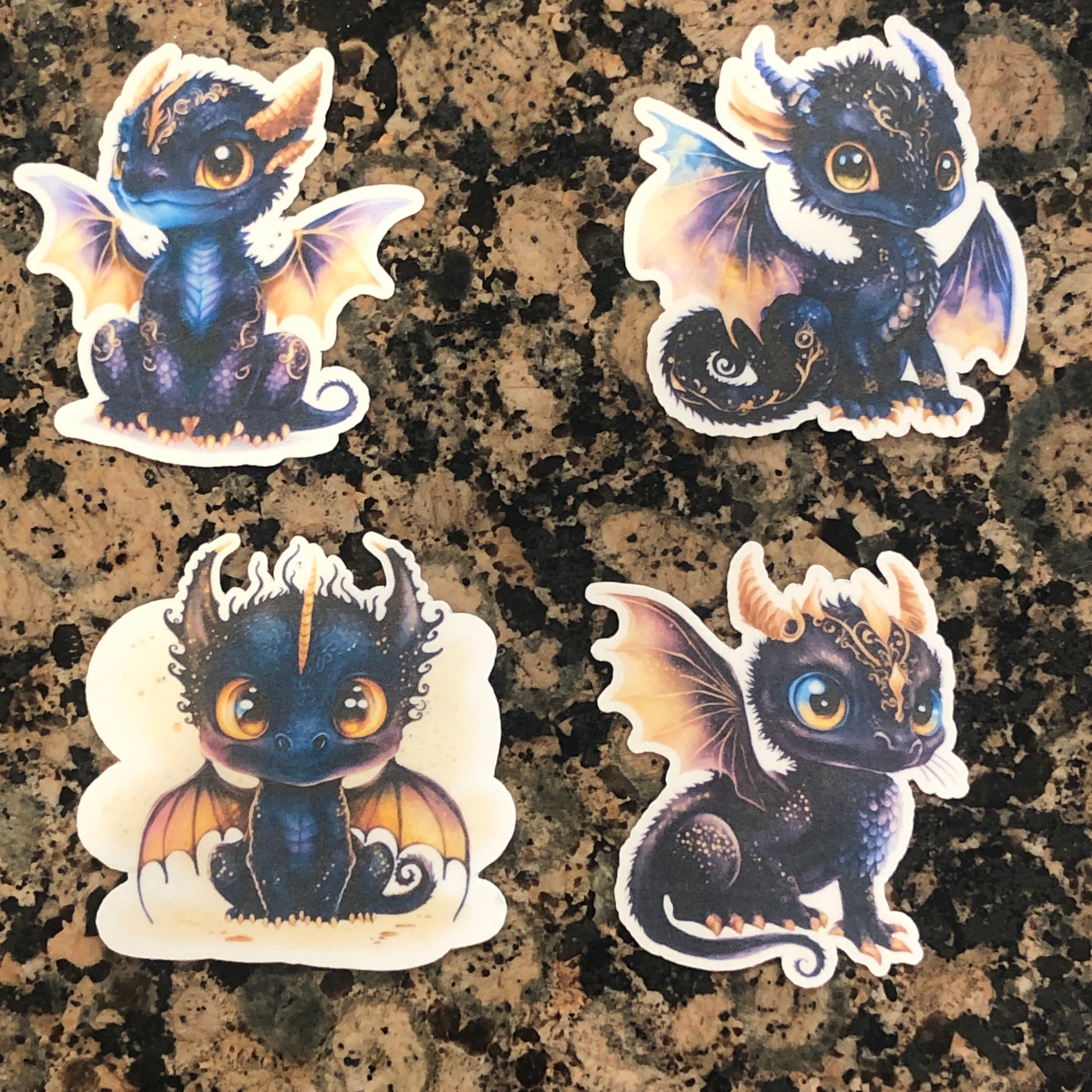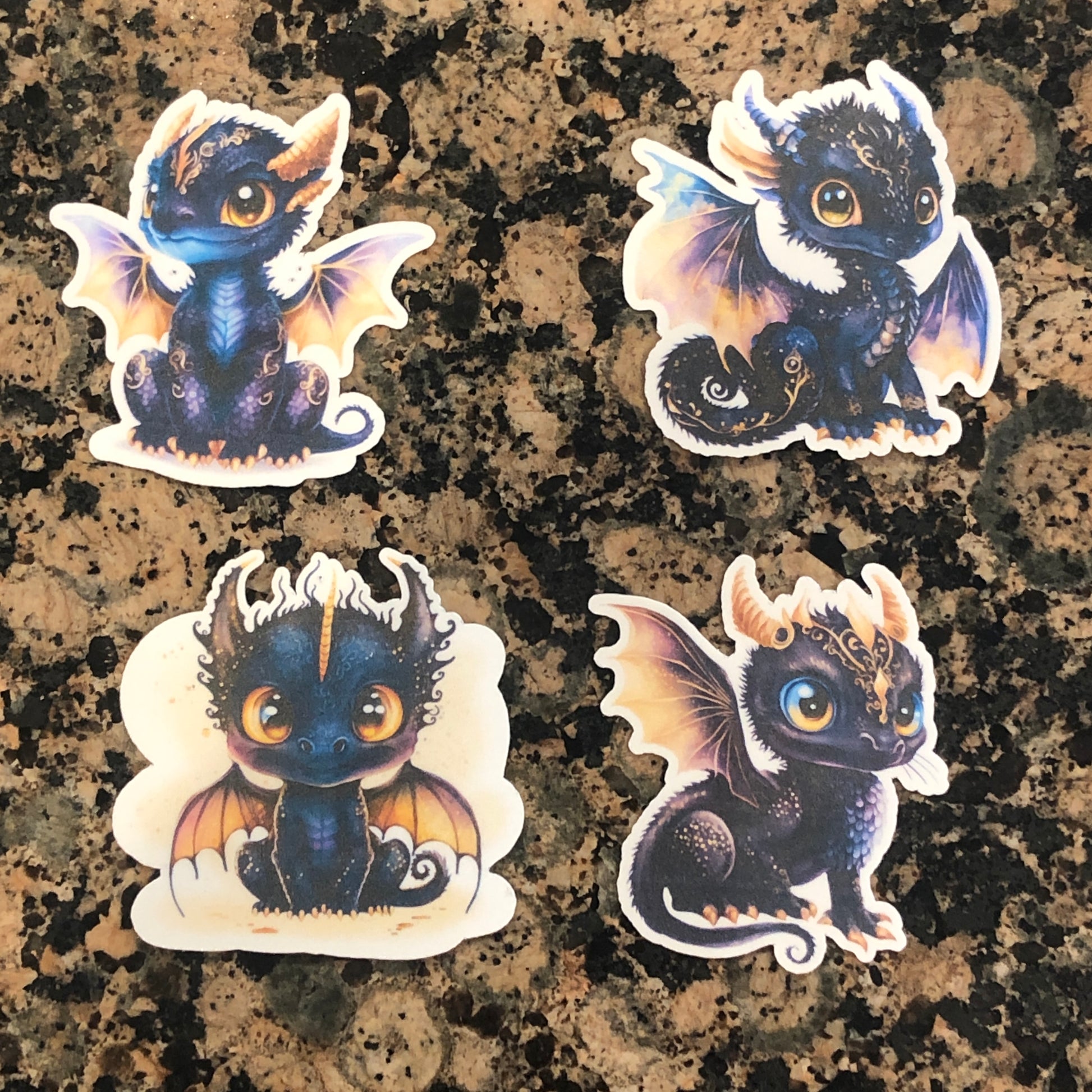 The baby dragons have hatched and are looking for a new home! Get all four adorable designs in this bundle. Stickers measure approximately 2.15-inches each and are sealed with a durable gloss laminate.