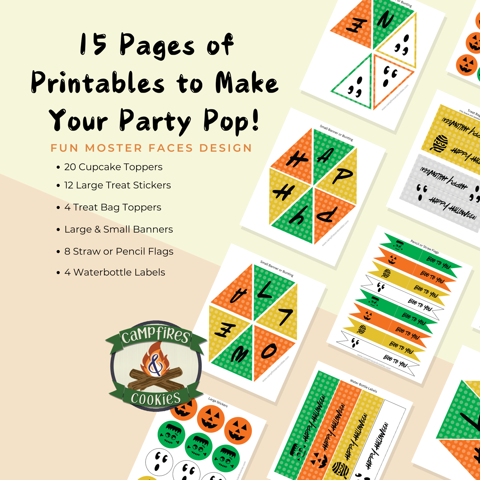 Your Halloween party will be monsterously great with these fun monster face themed party decorations. This Halloween pdf printable party decor kit features do-it-yourself print, cut and assemble crafts to make your party pop.