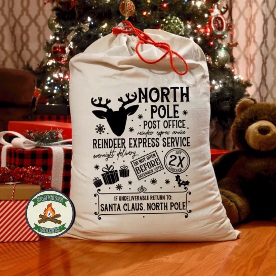 Deliver gifts in style! This North Pole Reindeer Express design is printed on an 18" X 24" canvas Santa Sack.