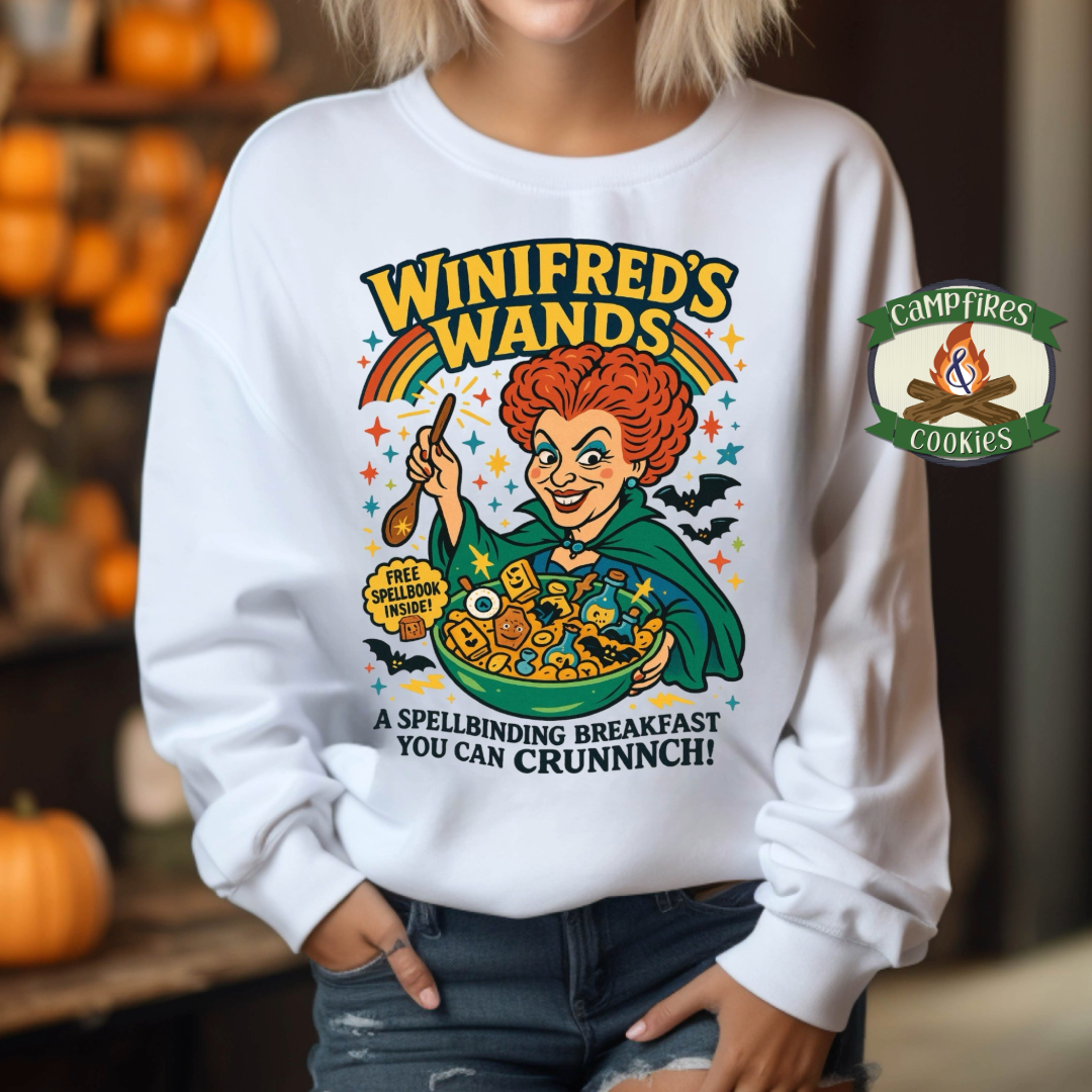 Get ready to stir up some mischief with the ultimate nostalgic breakfast spoof—Winifred’s Wands! This bold and playful graphic features a cereal-box style design starring your favorite red-headed spellcaster brewing up a crunchy concoction of magical mayhem. With rainbows, bats, and just a dash of spooky season sass, it’s the perfect pick for witchy women, Halloween lovers, and cereal-slaying queens.