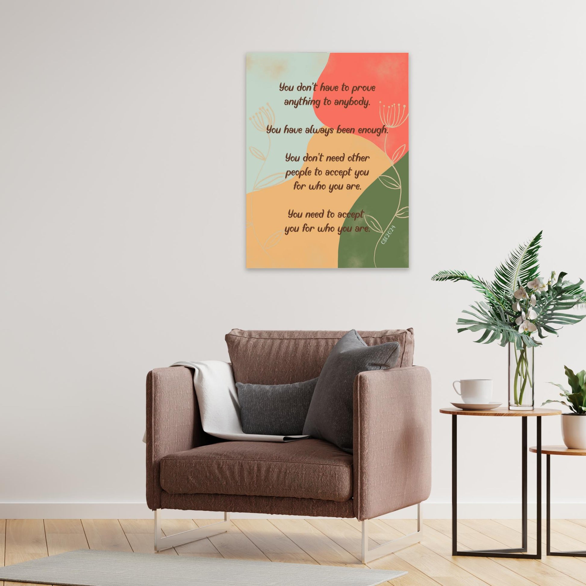 This inspirational poster is your reminder that you don't need to prove anything to anybody! Printed on high quality poster paper the design is sharp and clean with stunning color and vibrancy. Measures 12" wide by 18" long. Wipe clean with a cloth. Ships rolled in a tube.